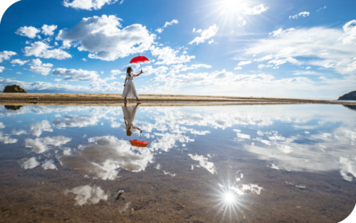 「ウユニ塩湖」のような写真が撮れると話題の香川県三豊市の父母ヶ浜(ちちぶがはま)。