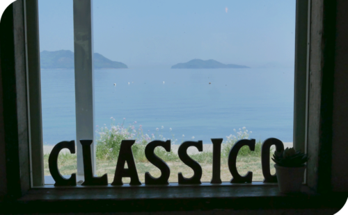 目の前には波静かな海岸が広がりテラス席からは粟島が一望できる。